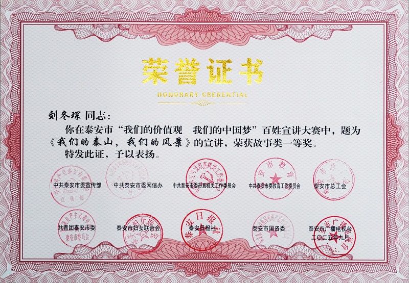 近日,中共泰安市委宣傳部等多部門(mén)聯(lián)合主辦的泰安市“我們的價(jià)值觀(guān)我們的中國(guó)夢(mèng)”百姓宣講大賽結(jié)果公布,泰山文旅集團(tuán)子公司泰山出品公司職工劉冬琛,憑借題為《我們的泰山,我們的風(fēng)景》的宣講,榮獲故事類(lèi)一等獎(jiǎng)。
