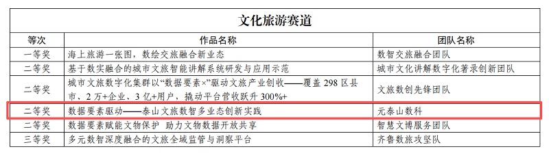 近日,由山東省大數(shù)據(jù)局、中共山東省委網(wǎng)絡(luò)安全和信息化委員會辦公室、共青團山東省委等多部門聯(lián)合主辦的2025年“數(shù)據(jù)要素×”大賽山東分賽圓滿落幕。泰山文旅集團子公司元泰山數(shù)字科技有限責任公司憑借“數(shù)據(jù)要素驅(qū)動——泰山文旅數(shù)智多業(yè)態(tài)創(chuàng)新實踐”項目,從眾多參賽作品中脫穎而出,獲文化旅游賽道二等獎。