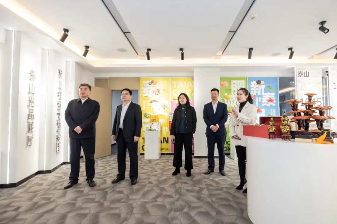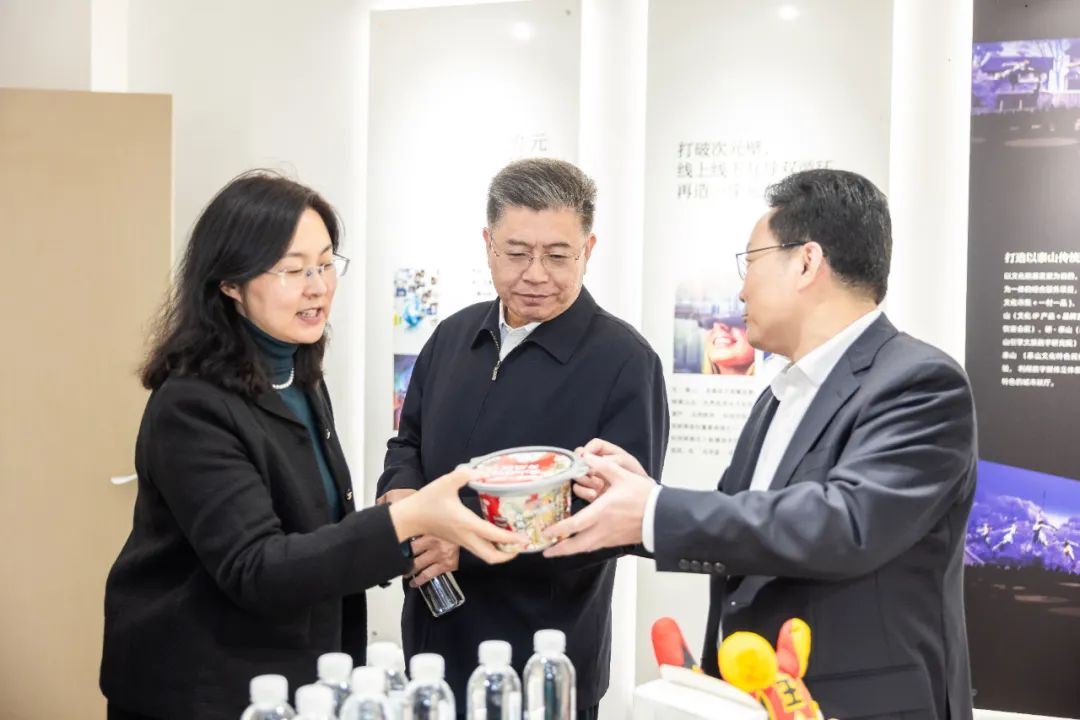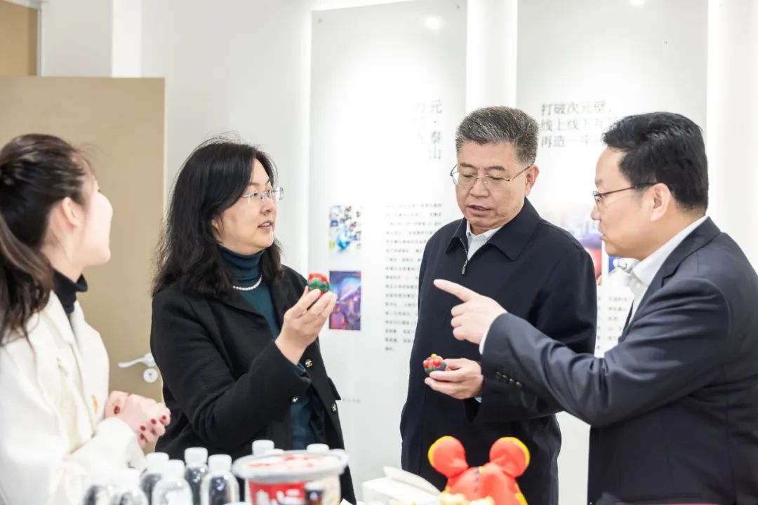 郭德文一行對智慧文旅基地、電商直播間、文創(chuàng)研發(fā)中心等區(qū)域進(jìn)行了實地參觀。并現(xiàn)場聽取工作人員對以泰山IP為核心的“泰山出品文創(chuàng)系列”、“元泰山數(shù)字科技”、“朝山歸文旅品牌”以及“泰山產(chǎn)品供應(yīng)鏈”等業(yè)務(wù)的詳細(xì)介紹。
