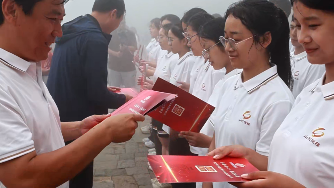 啟動儀式結(jié)束后,青少年們乘坐“民族團結(jié)號”至中天門,共同攀登泰山,感受泰山文化的博大精深。在岱頂大觀峰,泰岳青少年面向國旗莊嚴宣誓,“泰山長者”為他們頒發(fā)“成人證書”。