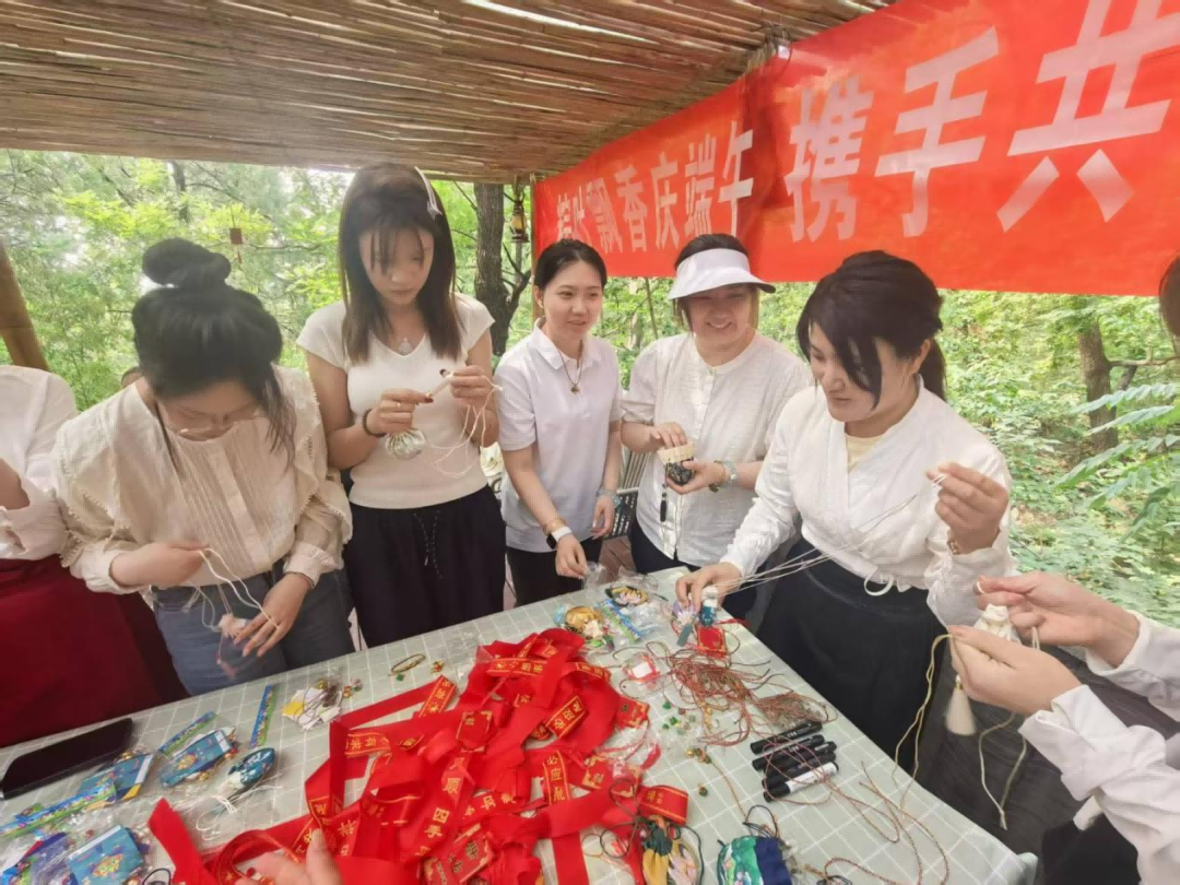 民俗活動是端午的重頭戲之一。制香囊、編彩繩、掛福牌、包粽子……泰山景區(qū)、泰山文旅集團的干部職工們歡聚一堂,共慶端午佳節(jié)。來自天馬旅行社的講師現(xiàn)場介紹了端午節(jié)的傳統(tǒng)習(xí)俗,講解了艾草香囊、五彩手繩、粽子的意義及制作方法。一根根絲線在指尖纏繞,寓意驅(qū)邪避災(zāi)、平安吉祥的手繩逐漸成型。大家將香囊掛于腰間,把手繩戴于腕上,將承載對家人祝福的福牌掛在民宿的籬笆上、杏樹上,現(xiàn)場節(jié)日氣氛濃厚。